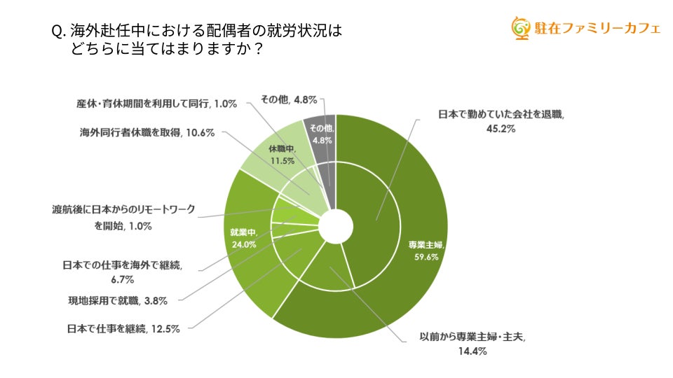 - 共働き世帯が多い現代に、駐在帯同を理由に退職した方が駐在員配偶者の45.2%。帯同せず別居を選択し日本で仕事を継続する方が12.5%、海外帯同休職・産休・育休制度などを利用して駐在帯同した方が11.6%、他にも日本の仕事を海外からリモートで継続する方や、現地採用で就職する方など、少しずつだが多様化傾向。